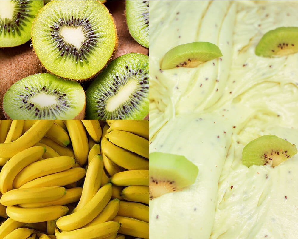 而水果我們則是挑選新鮮的紐西蘭奇異果,並搭配屏東盛產的香蕉。和其他水果雪酪的製作過程一樣,都是將水果一顆顆手工剝皮處理,以保留奇異果和香蕉天然豐富的維他命C、鉀,並使製作出的雪酪保有水果纖維、果肉的食感,打造多層次的風味和口感。