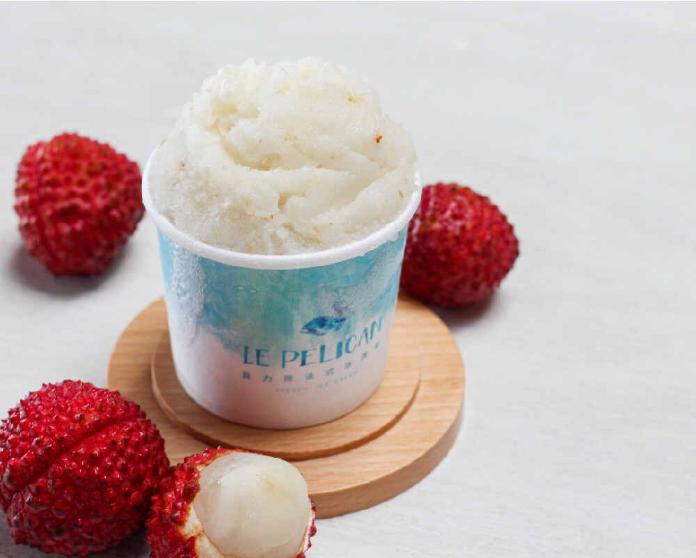 水果的選擇上我們採用荔枝中的極品-新鮮玉荷包,此外玉荷包荔枝的產季非常短,而我們只使用於五月上旬至六月上旬的當季玉荷包荔枝,因此荔枝雪酪是每年僅有幾個月能品嚐到的季節限定口味。