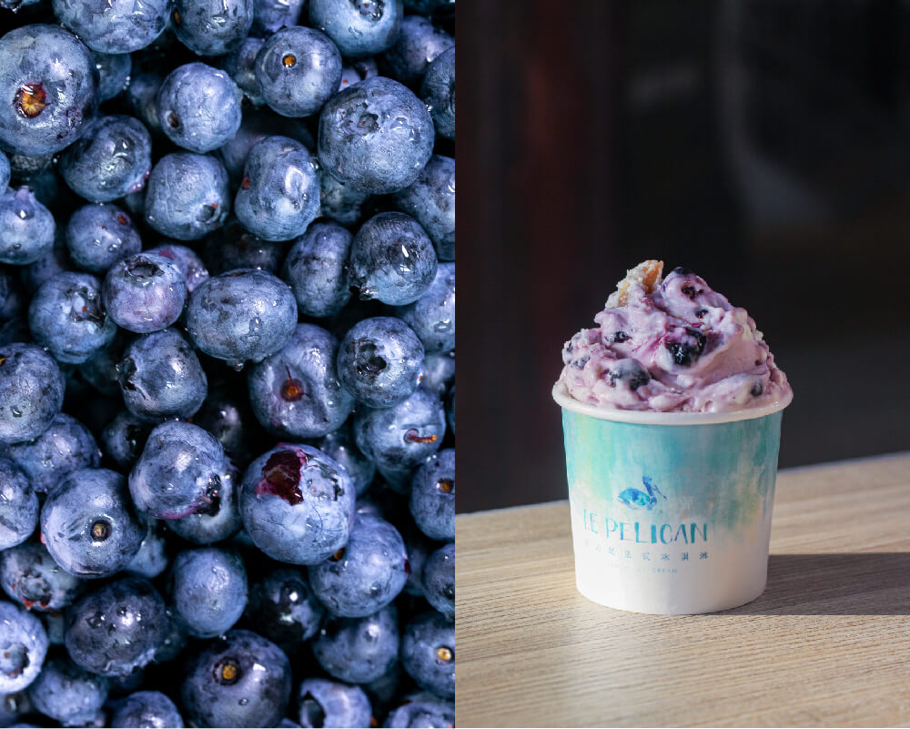 在市面上販售的許多藍莓冰淇淋,是使用藍莓風味醬製作。而我們期望我們的客人都能吃到以真實水果製作的冰淇淋,所以在食材選擇上,我們採用加拿大進口的頂級野生藍莓。野生藍莓的體型較小不易收成,但味道比養殖藍莓更濃郁。