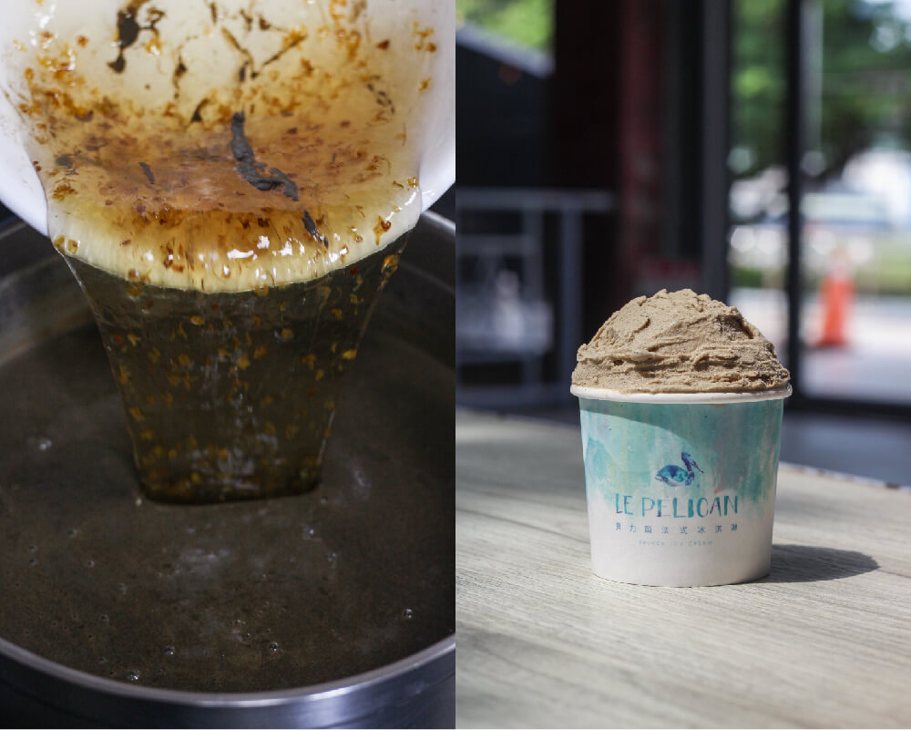 我們使用自然農法耕種的重焙烏龍茶葉,將茶葉香氣熬煮出後,再將細膩熬製的桂花釀拌入烏龍茶中,並以慢火熬煮至濃稠,且食材之間完全融合,再製作成冰淇淋。呈現桂花香前調、烏龍茶底蘊,將清麗花香與醇厚茶韻完美結合。