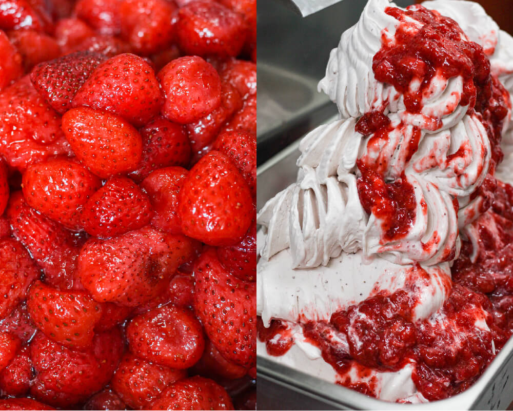 一般市售的草莓牛奶冰淇淋,通常只吃的到草莓的味道,卻不見其身影。我們希望在草莓冰淇淋中,能讓客人品嘗到真實的草莓果肉。