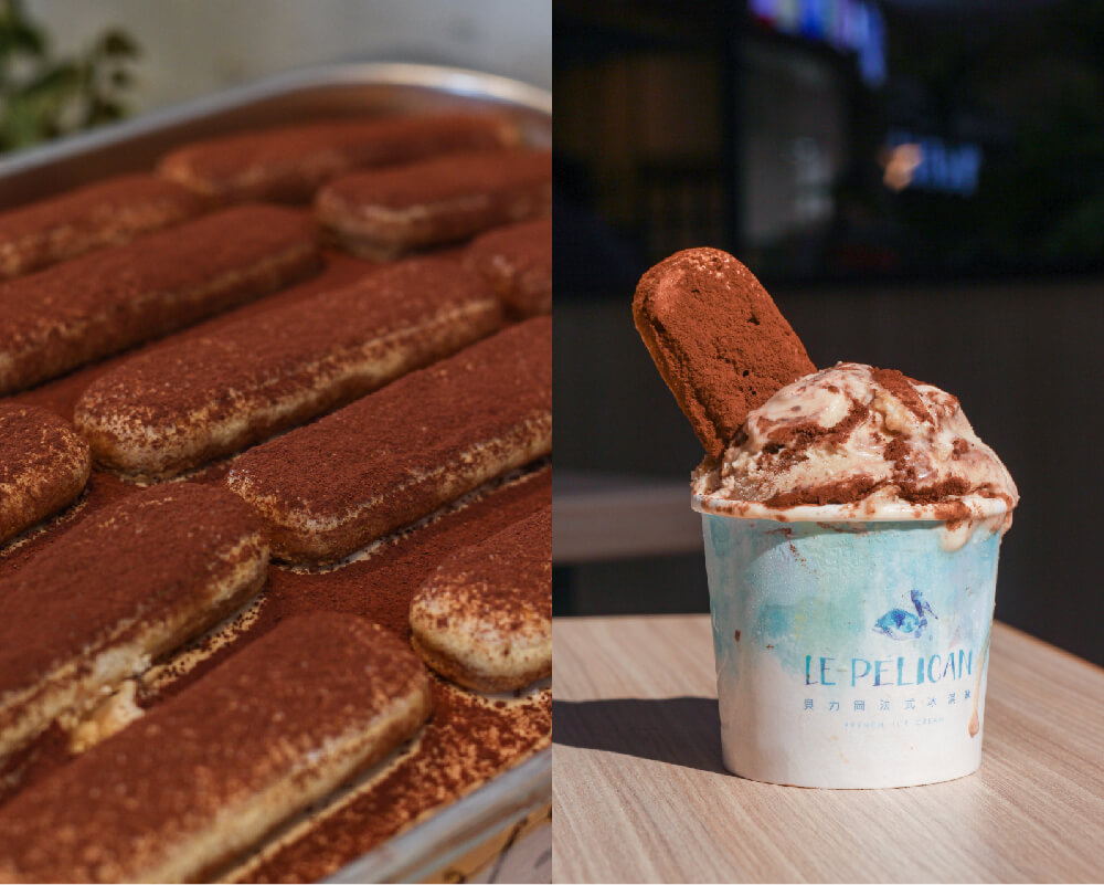 食材的處理上,將眾多食材的風味達到完美的平衡,使每樣食材的風味完整發揮,並香醇的冰淇淋基底上鋪上浸滿咖啡酒的手指餅乾。