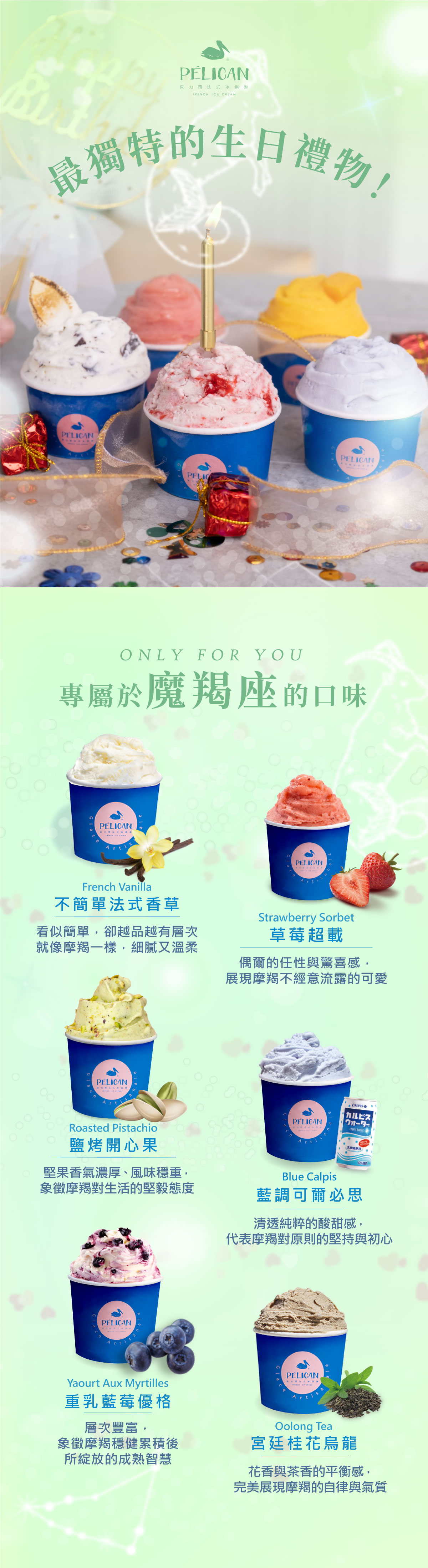 此組合精選六款為摩羯座量身打造的冰淇淋口味,給壽星一個大大的驚喜吧!