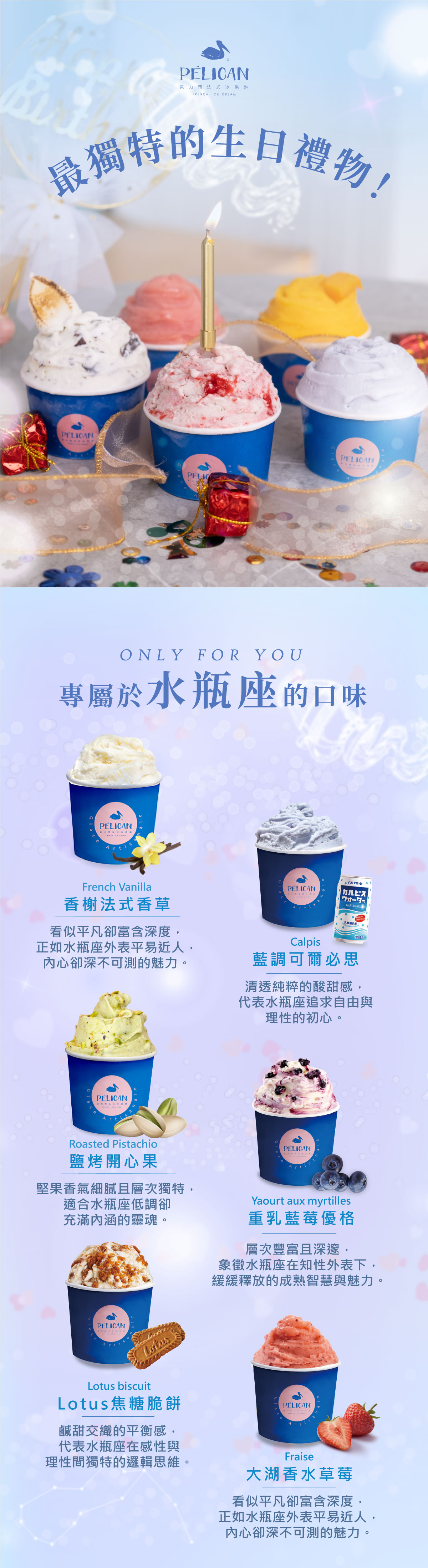 此組合精選六款為水瓶座量身打造的冰淇淋口味,給渴望與眾不同的他一個大大的驚喜吧!