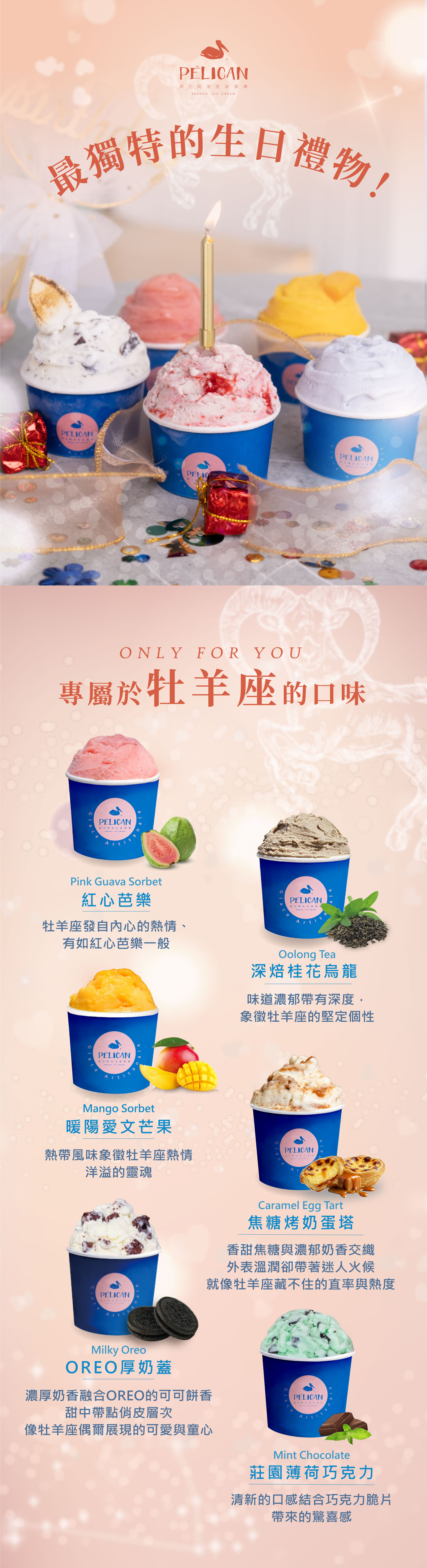 此組合包含六種為牡羊座量身定做的冰淇淋口味,給壽星一個大大的驚喜吧!