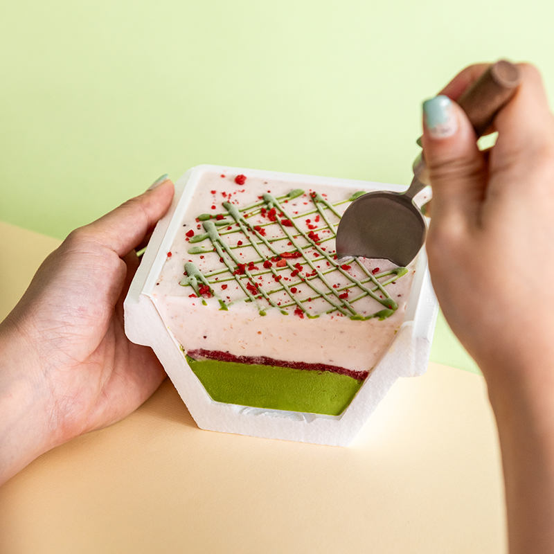 濃郁抹茶冰淇淋,堆疊草莓果泥與草莓歐蕾冰淇淋,