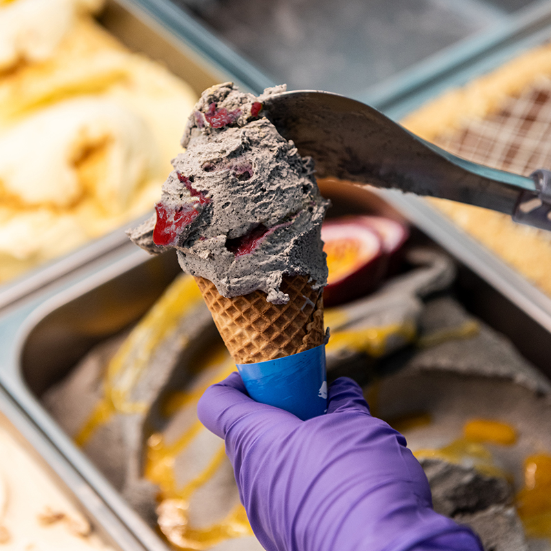 上選黑芝麻原粒細緻研磨,製成香氣濃厚的芝麻冰淇淋,最後拌入莓果庫利,